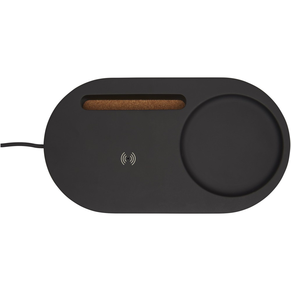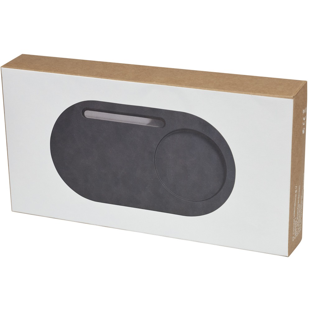 5W-os vezeték nélküli töltő- és asztali szervező természetes mészkő és parafa kombinációjából. Vezeték nélküli technológia nélküli készülékek töltéséhez külső vezeték nélküli töltő vevőre vagy vevőházra van szükség. Ajándékdobozba csomagolva és használati utasítással együtt érkezik (mindkettő fenntartható anyagból készült). 100 cm-es USB-kábelt tartalmaz.