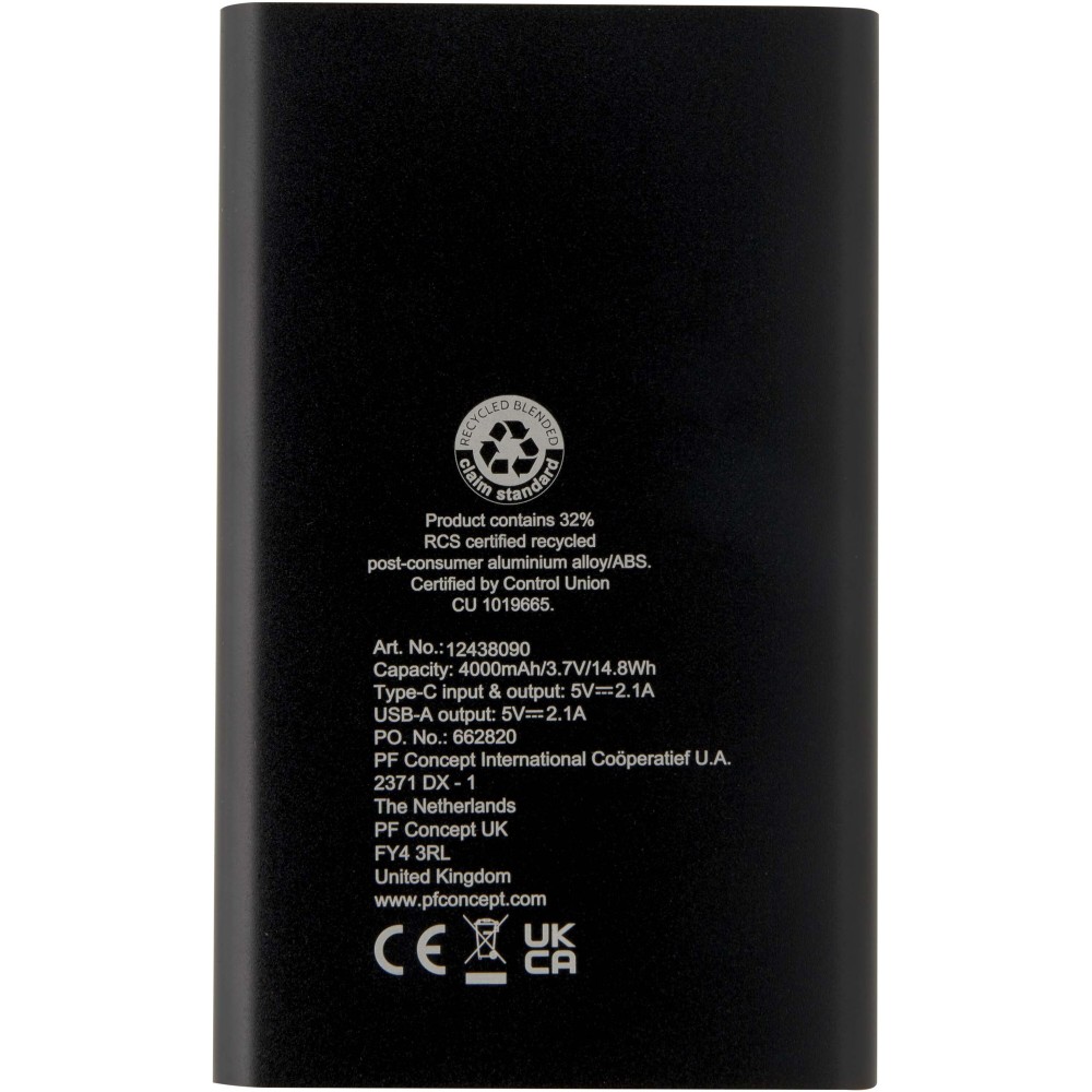 Pep Type-C újrahasznosított alumínium powerbank, 4000 mAh, fekete
