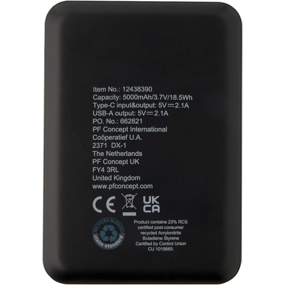 Asama újrahasznosított műanyag powerbank, 5000 mAh, fekete
