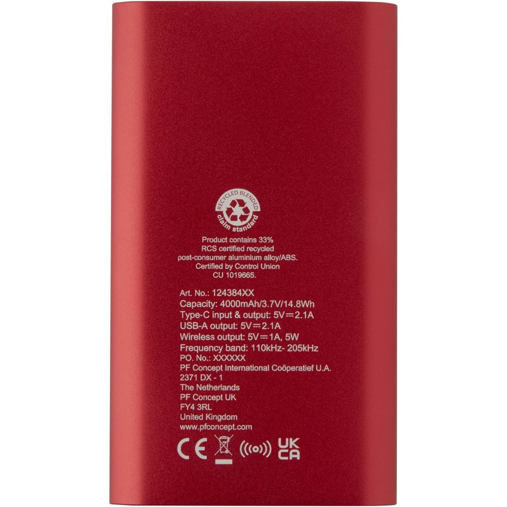 Powerbank Type-C bemeneti/kimeneti porttal és USB-A porttal, amely lehetővé teszi két eszköz egyidejű töltését. Támogatja az 5W vezeték nélküli töltést minden Qi-kompatibilis eszköz számára. A powerbank 4000 mAh kapacitású lítium-polimer akkumulátorral rendelkezik, amely max. 10W teljesítményt biztosít. A powerbank 28%-ban RCS tanúsítvánnyal rendelkező újrahasznosított műanyagból készült. TPE Type-C - USB-A töltőkábellel szállítjuk.