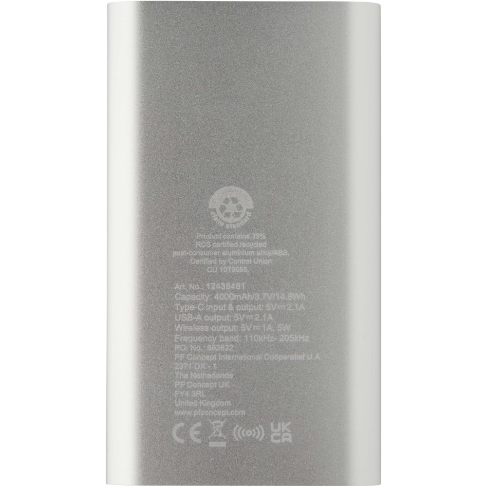 Powerbank Type-C bemeneti/kimeneti porttal és USB-A porttal, amely lehetővé teszi két eszköz egyidejű töltését. Támogatja az 5W vezeték nélküli töltést minden Qi-kompatibilis eszköz számára. A powerbank 4000 mAh kapacitású lítium-polimer akkumulátorral rendelkezik, amely max. 10W teljesítményt biztosít. A powerbank 28%-ban RCS tanúsítvánnyal rendelkező újrahasznosított műanyagból készült. TPE Type-C - USB-A töltőkábellel szállítjuk.