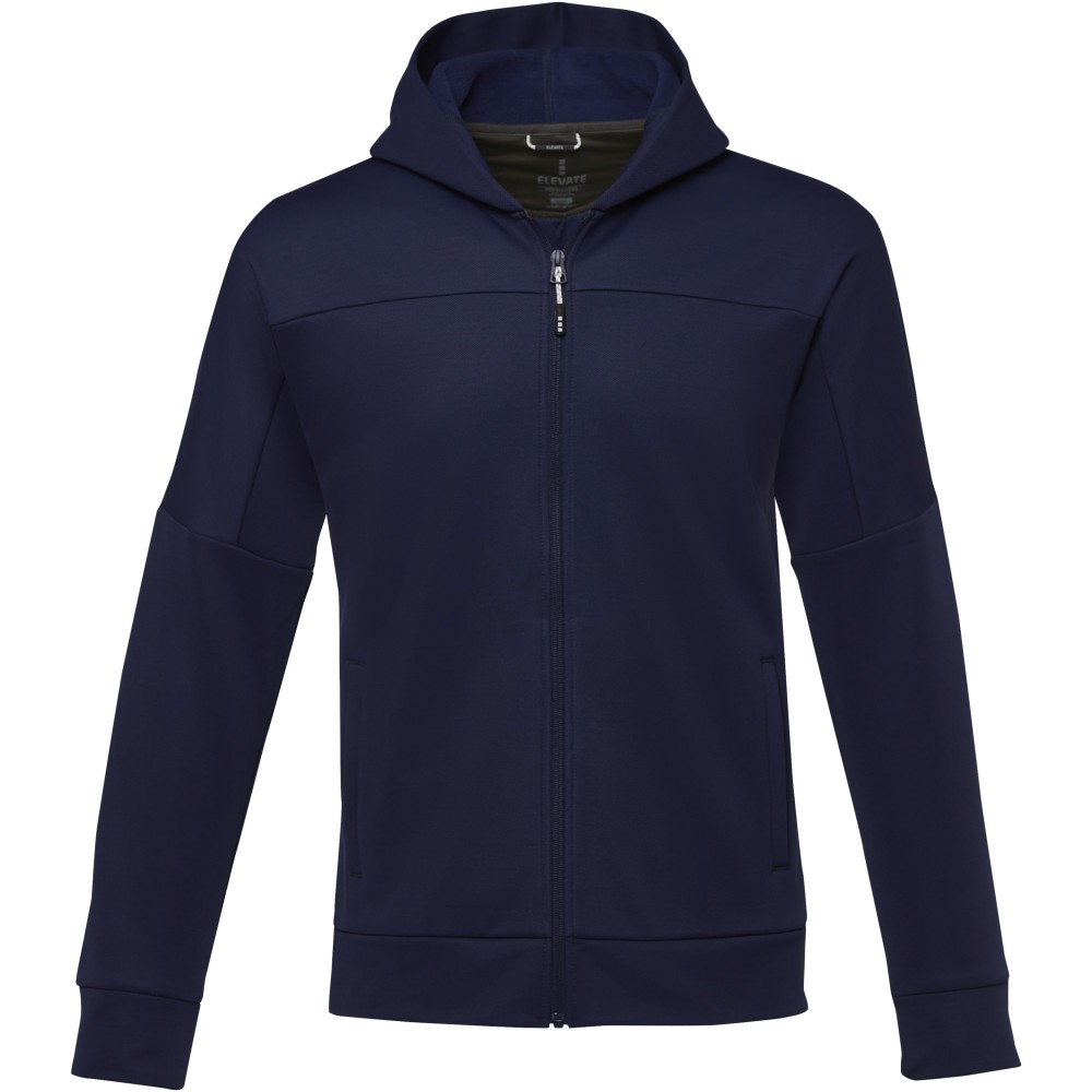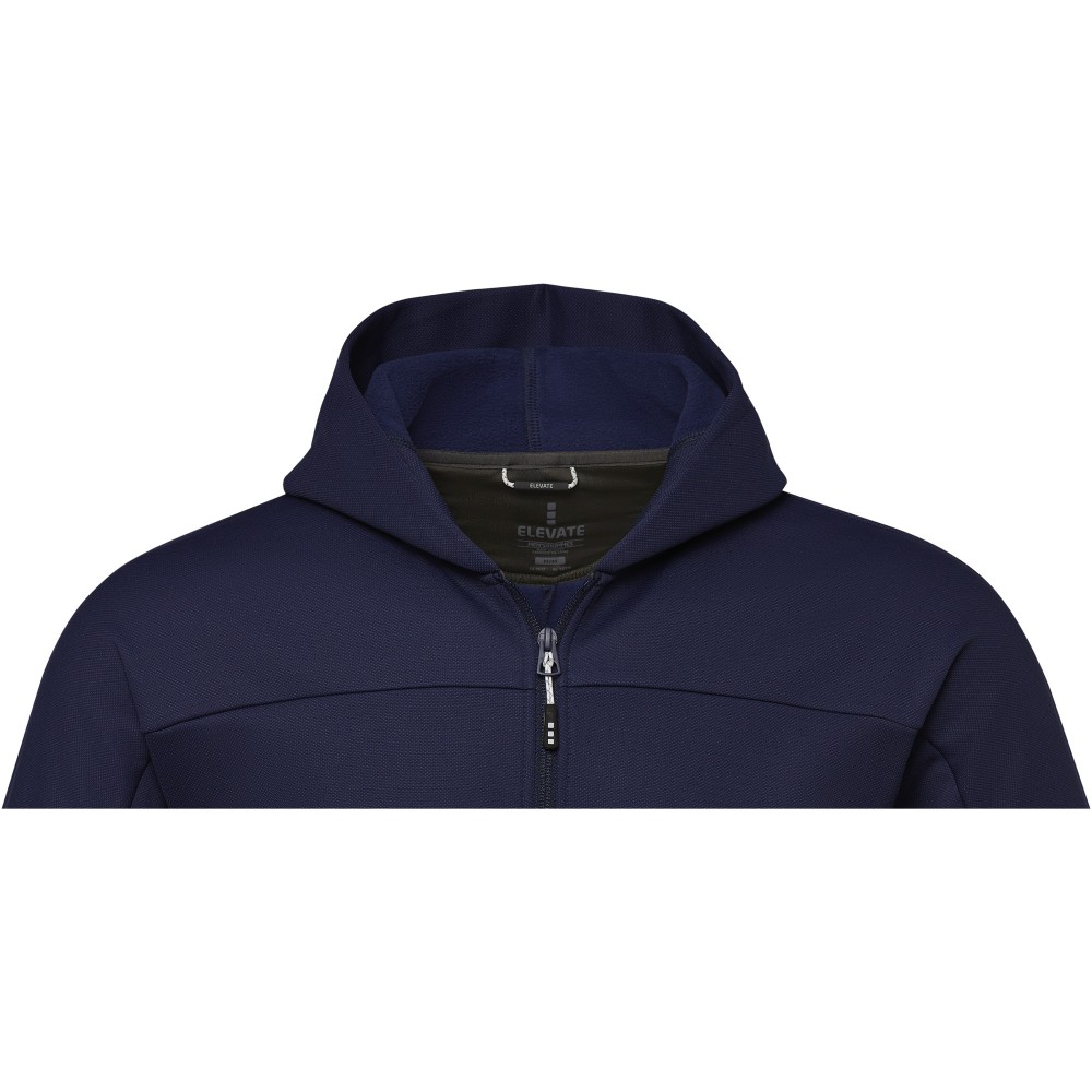 Középen elöl fordított cipzár. Elülső zsebek. Márkázott akasztó. Szatén nyakszalag. Belső médiakimeneti port kábelvezetővel. Félhold betét a nyaknál. Kötött 70% poliészterből és 30% Sorona ( r) anyagból, 245 g/m2.