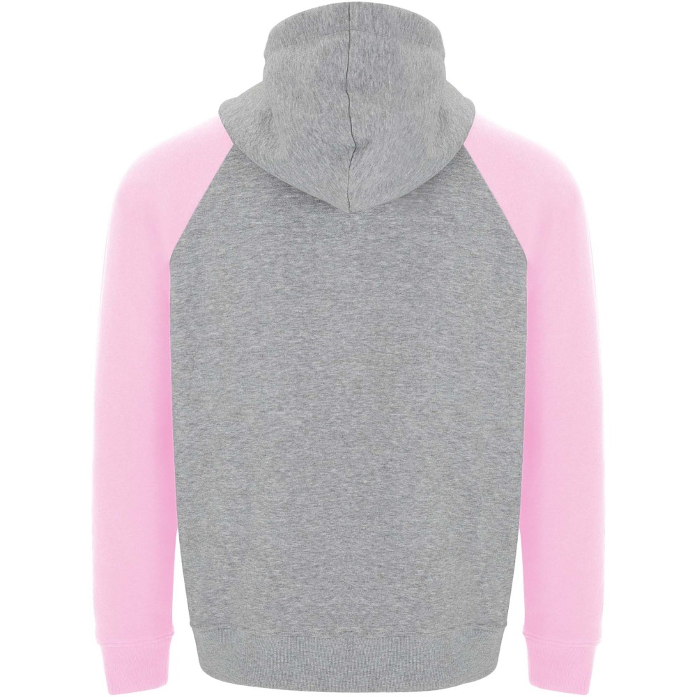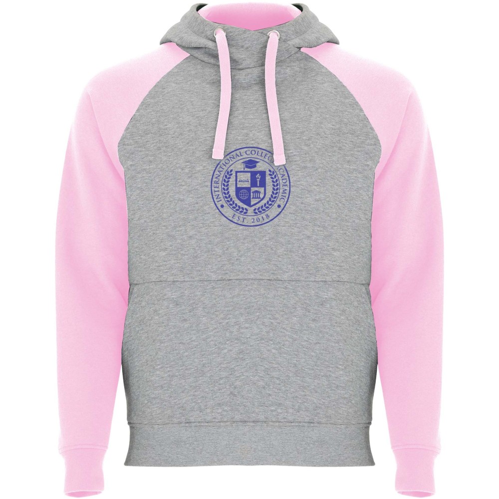 Két színű uniszex kapucnis pulóver. Kapucni keresztezett nyakrésszel és fém kiegészítőkkel. Kontrasztos belső rész a kapucnin, húzózsinór és raglán ujjak. Kenguru zseb. Rugalmas 1x1 passzék és alj. Levehető címke.