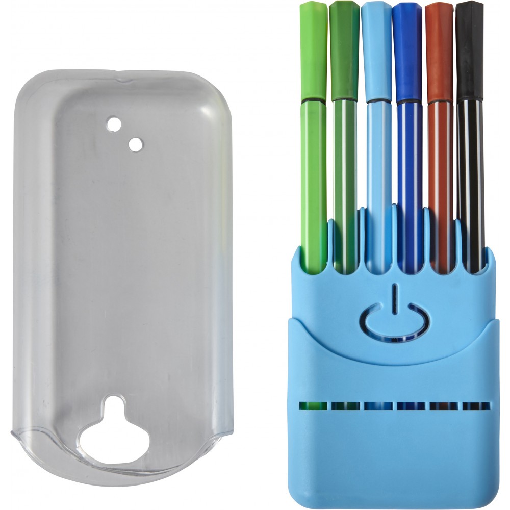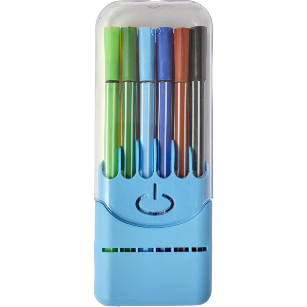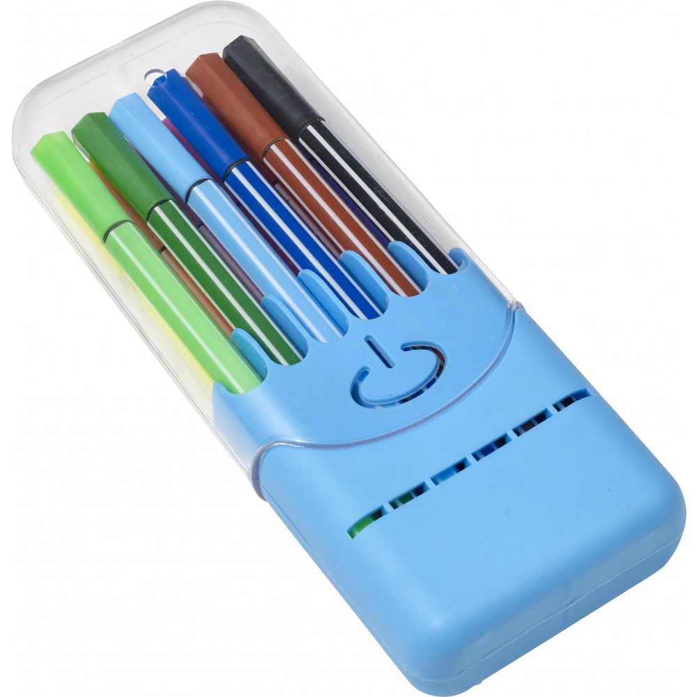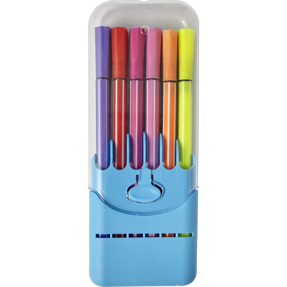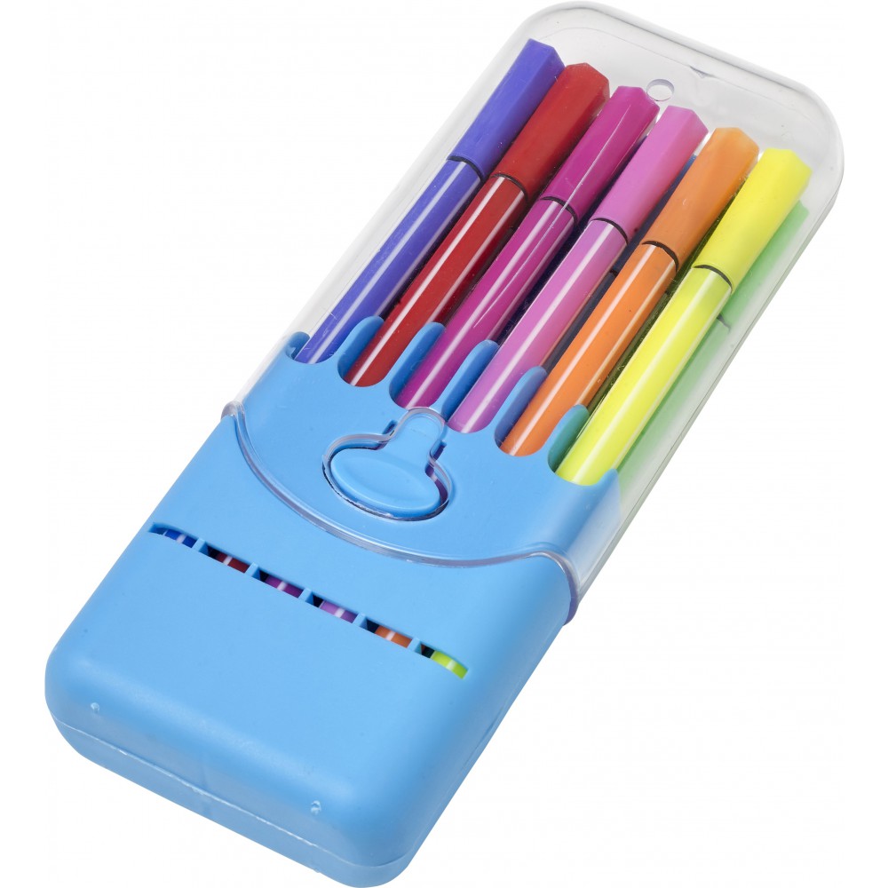 Filctollkészlet átlátszó műanyag dobozban, 12 db filctollal.