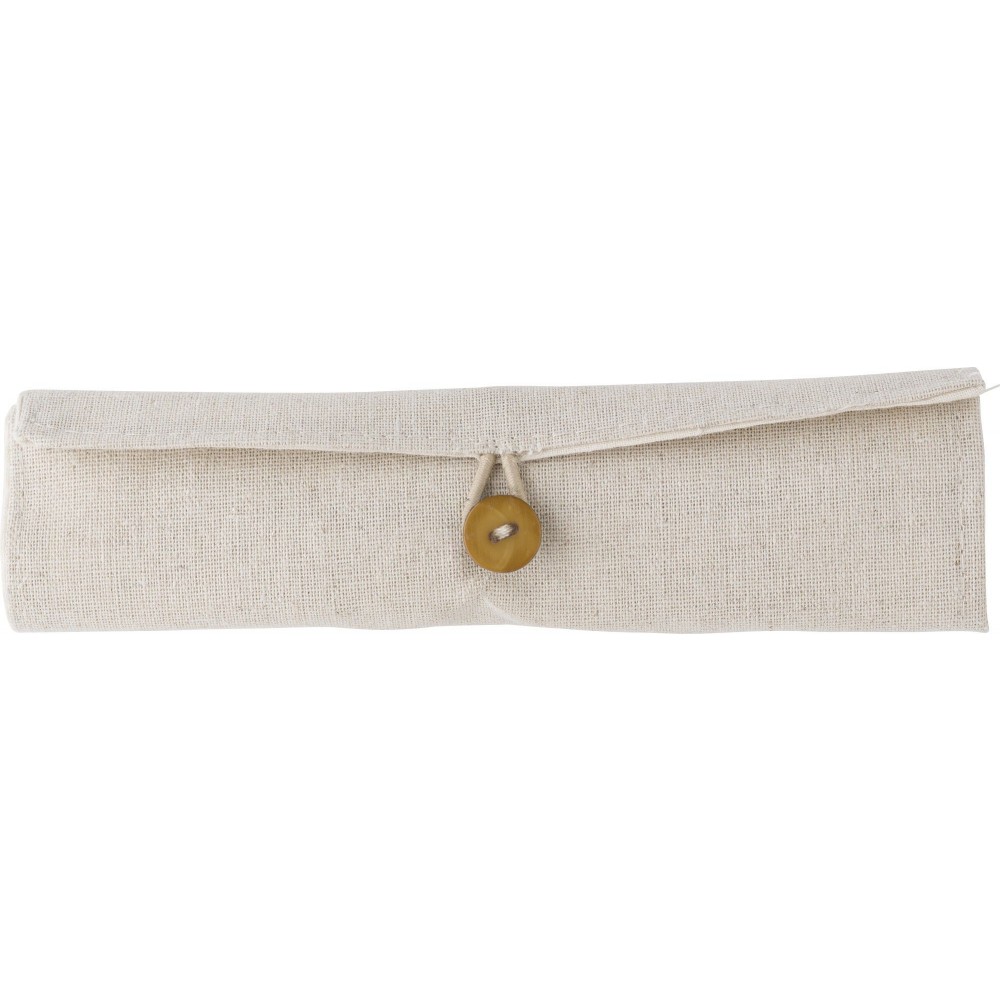 Irodaszerkészlet pamut tartóban. Tartalma: bambusz vonalzó, fa hegyező, radír, ceruza, golyóstoll kék tollbetéttel.