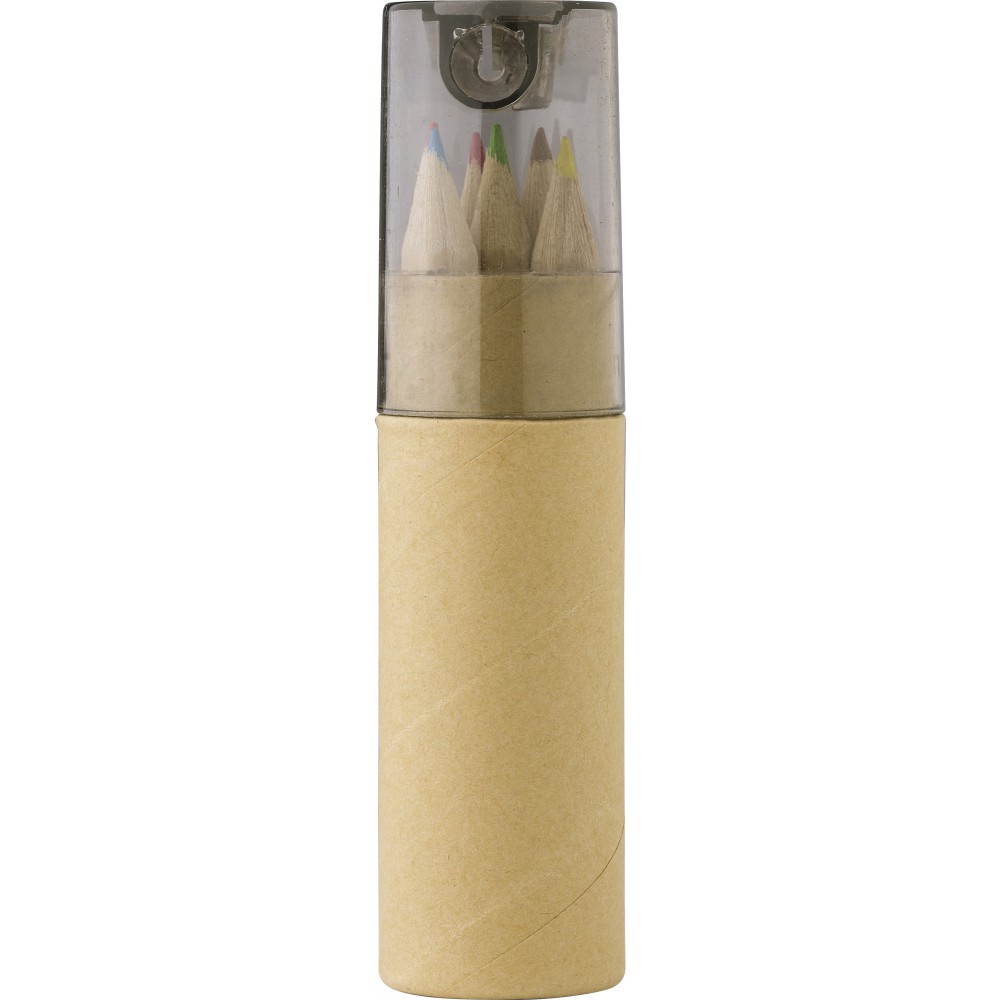 6 db-os színesceruza készlet henger alakú papírdobozban, ceruzahegyezővel.