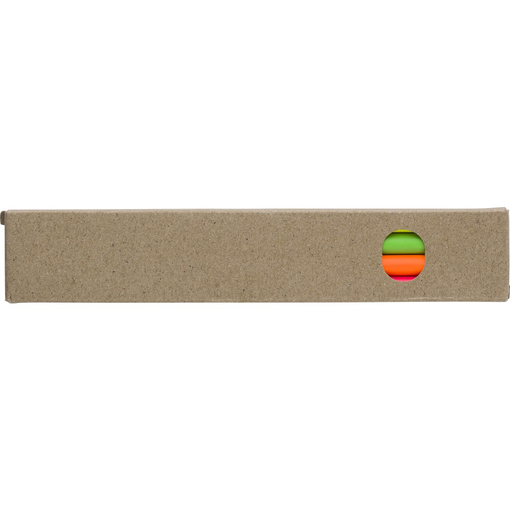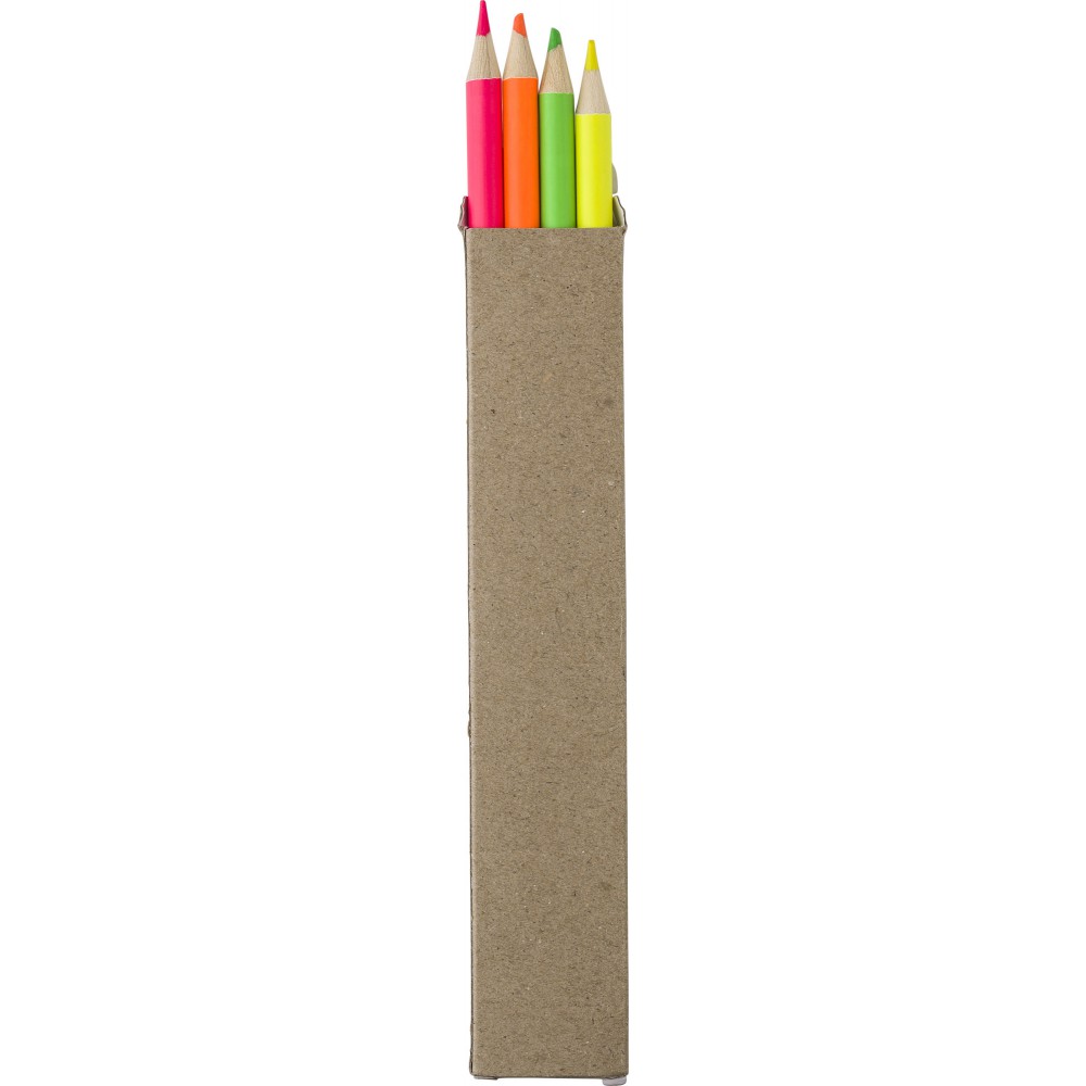 Fa szövegkiemelő ceruzakészlet 4 színesceruzával (sárga, narancs, rózsaszín és zöld) papírdobozban.