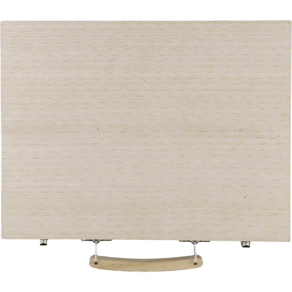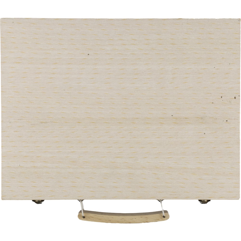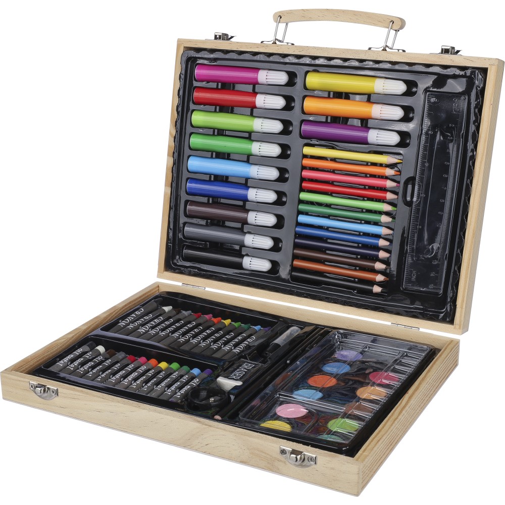 66 db-os rajzkészlet fa tartóban, fa fogantyúval. Tartalma: 12 db zsírkréta, 12 db színes filctoll, 12 db kihegyezett színesceruza, 12 db olajpasztell kréta, 12 db festék, ragasztóstift, radír, ceruzahegyező, vonalzó, ecset és festőpaletta. Csomagolása barna papírdoboz.