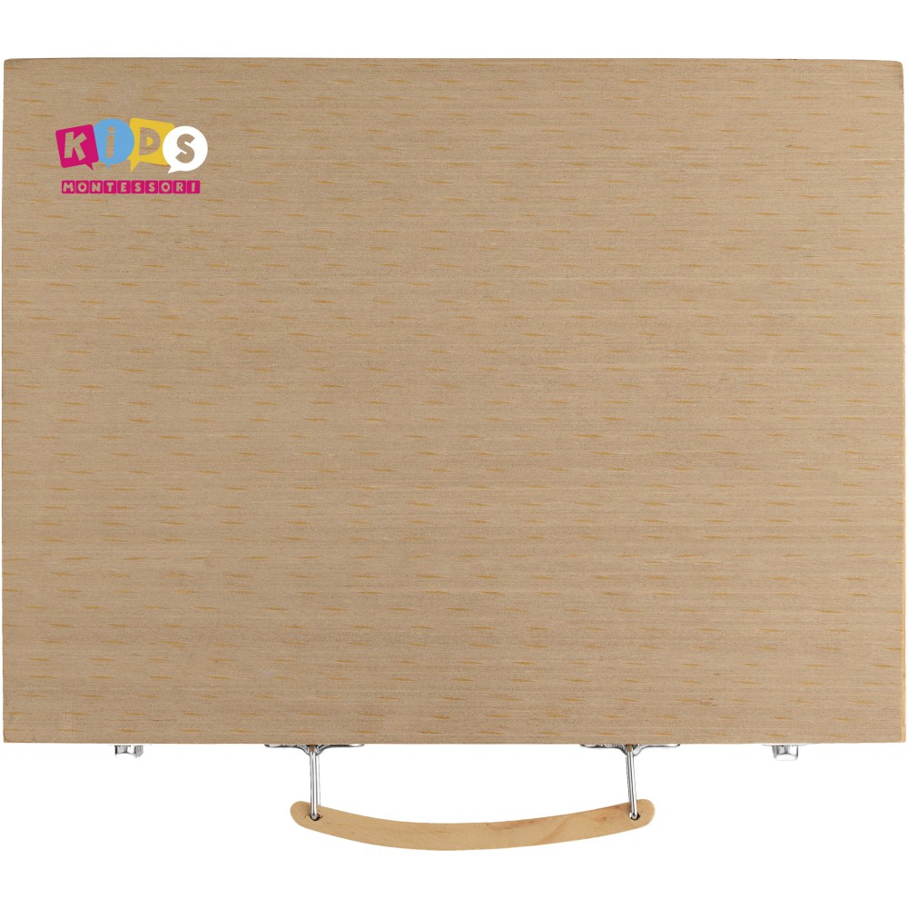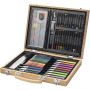 12 vízfesték, 12 színesceruza, 12 filctoll, 12 olajos pasztellkréta, 12 zsírkréta, paletták, ragasztó, radír, hegyező, HB ceruza és ecset fadobozban.