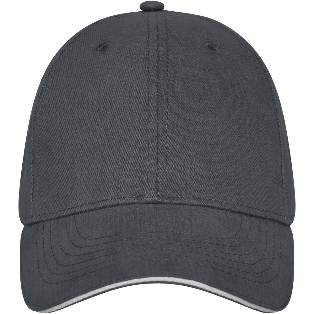 6 paneles szendvics baseballsapka ívelt simléderrel, hímzett szellőzőkkel, fém csattal. 100% twill pamut, 260 g/m2.