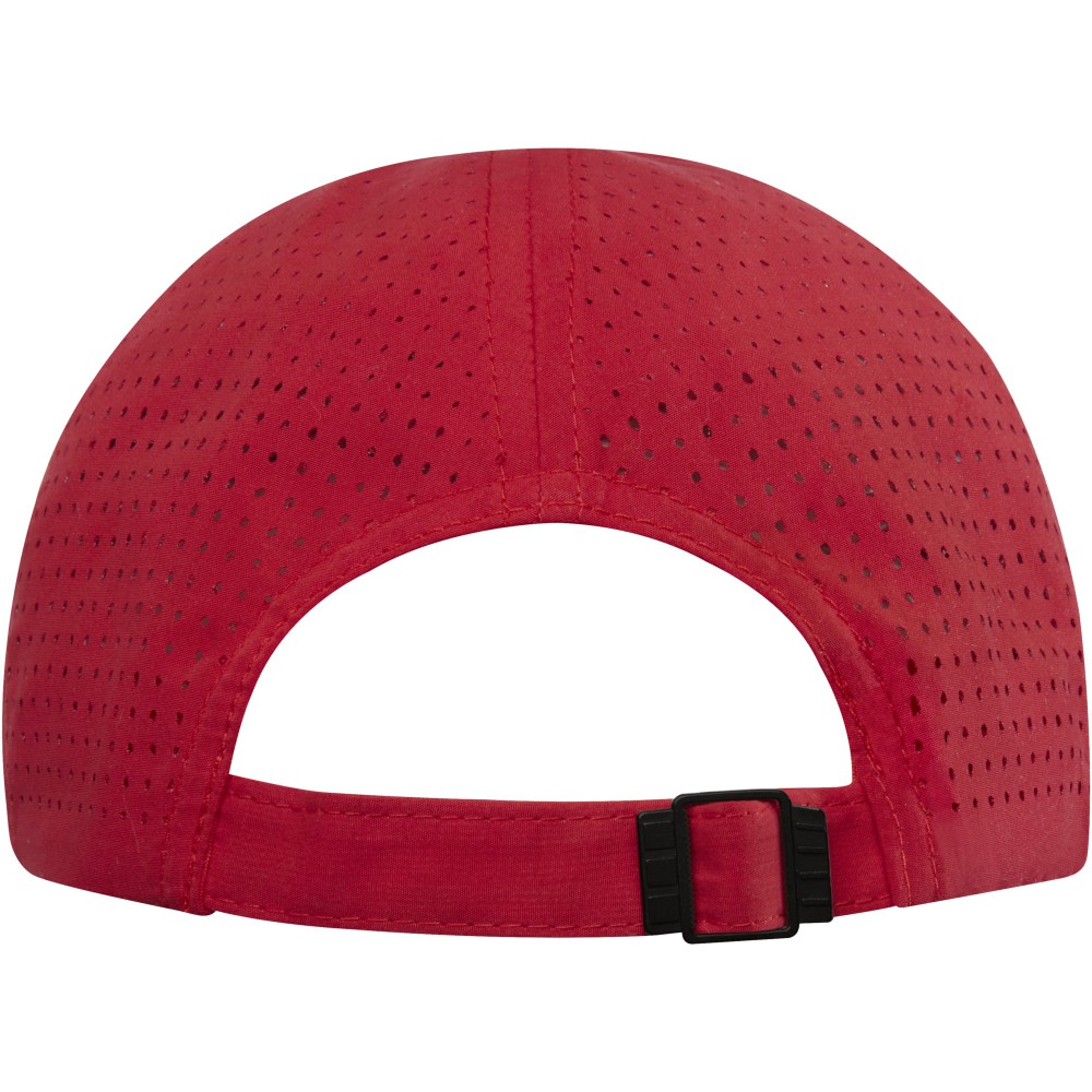 Újrahasznosított poliészterből készült, GRS tanúsítvánnyal rendelkező baseballsapka fém csattal. A hátsó panelek lézeres technikával vágott szellőzőkkel rendelkeznek. 110 g/m2.