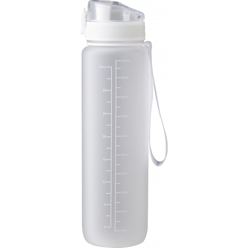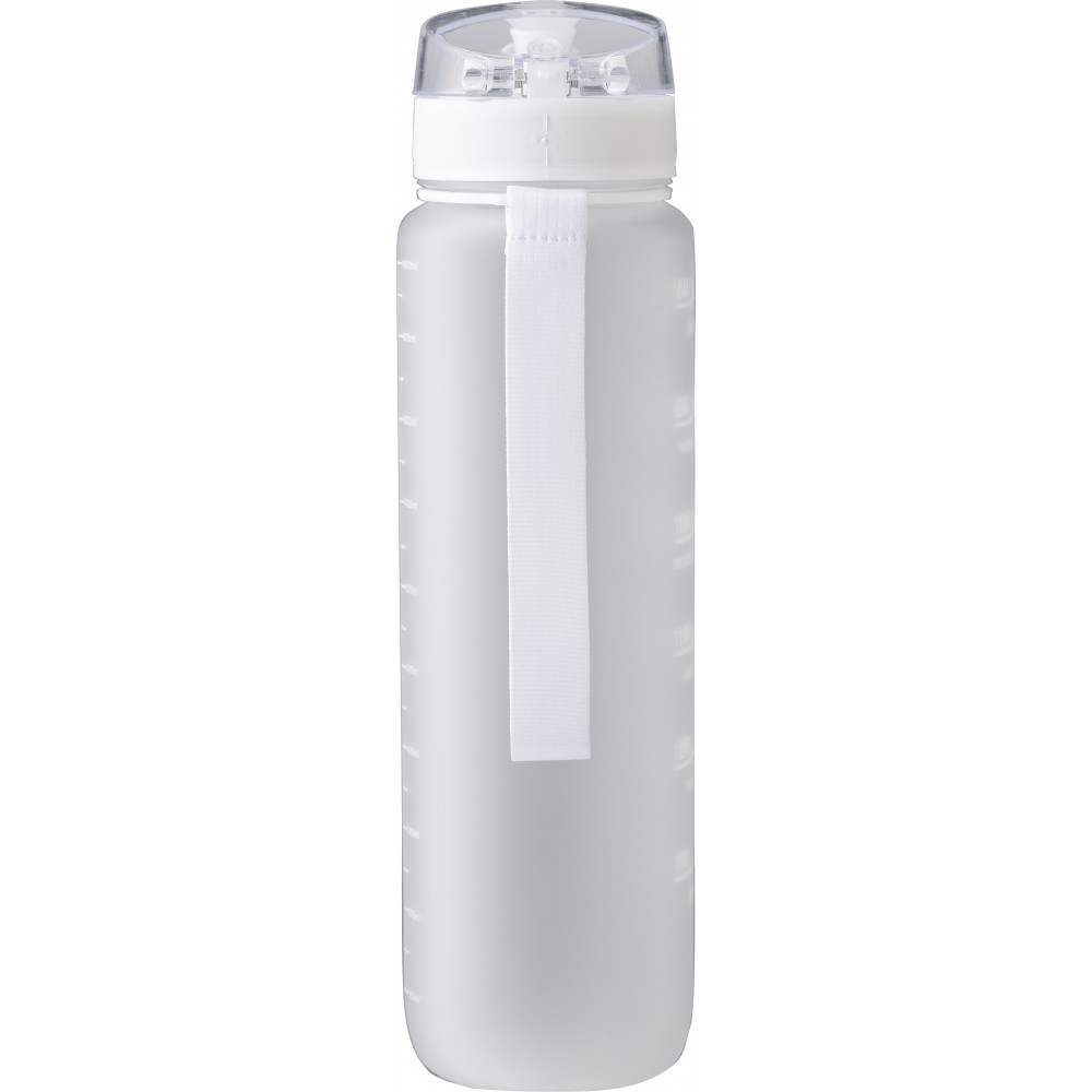 Műanyag motivációs palack szivárgásmentes kupakkal, csuklópánttal, matt bevonattal. Oldalán beosztással. Űrtartalom: 1 liter.