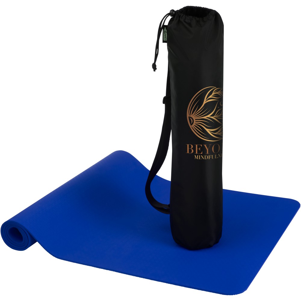 Újrahasznosított TPE műanyagból készült jógaszőnyeg. A TPE természetes csúszásgátló tulajdonságokkal rendelkezik, így stabil felületet biztosít, amely segít megelőzni a csúszást a jógapózok során. Az újrahasznosított TPE felhasználása a jógaszőnyegek gyártása során segít csökkenteni a hulladékok mennyiségét, és elősegíti a környezet fenntarthatóságát azáltal, hogy minimalizálja az új műanyagok használatát. Mérete: 173 x 61 x 0,6 cm. A tasak RPET anyagból készült.