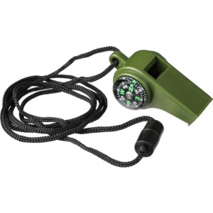 Síp (90 dB) iránytűvel és hőmérővel. A hőmérő Celsius-fokban mutatja a hőmérsékletet. Tartalmaz egy 100 cm-es poliészter nyakpántot ABS biztonsági csattal. Egyenként barna kartondobozba csomagolva. Anyaga: PP.