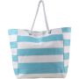 Strandtáska fehér és színes csíkokkal, zsinór fülekkel, belül mágneses patent záródással. Anyaga: pamut, papír, poliészter, vas.