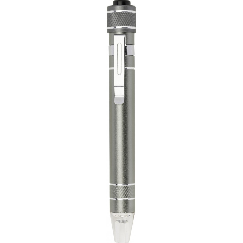 Alumínium csavarhúzókészlet lámpával. Tartalma: 3 db lapos csavarhúzó és 3 db csillagcsavarhúzó. Az elemet tartalmazza.