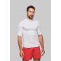 Gyorsan száradó sztreccs anyag. 40+ UV-védelem az EN13758-1 szabvány követelményeinek megfelelően. Rövidujjú. Magasnyakú. Testhezálló fazon. Gumis csat az elülső szegélyen belül a rövidnadrág zsinórja és a póló megtartására. Kontrasztos topstitch öltés. Duplatűzött szegések. 92% poliészter és 8% elasztán. 160 g/m2.