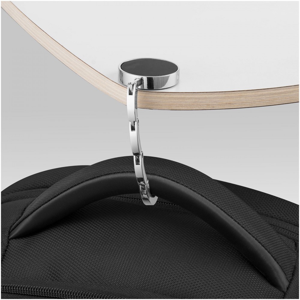 Összehajtható táskaakasztó, mellyel tisztán és biztonságban tarthatja táskáját. Az akasztót bármely felszín peremére felrögzítheti, max. 4,5 kg súlyt bír el. Fekete ajándékdobozban.