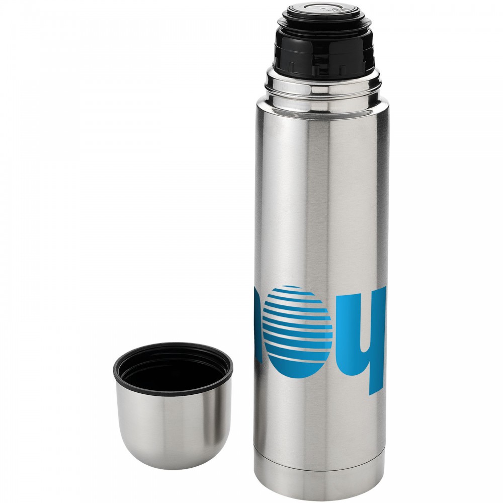 Duplafalú termosz pohár alakú tetővel. Egy kézzel használható, nyomógombos kiöntő, amely automatikusan bezár, ha a poharat rácsavarja a termosz tetejére. Kapacitás 750 ml.