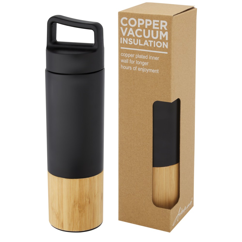 Réz vákuum szigetelésű 18/8 rozsdamentes acél palack, amely több órán keresztül melegen vagy hidegen tartja az italokat. Divatos bambusz részlettel, a fedél tetején lévő fogantyúval pedig könnyen hordozható. A palack széles nyílású, így könnyen tölthető és tisztítható. A német élelmiszerbiztonsági jogszabályok (LFGB) szerint tesztelték és jóváhagyták, és a REACH előírásai szerint tesztelték a ftaláttartalmat. Szivárgásmentes. Szénsavas italokkal nem használható. Mosogatógépben nem mosható és mikrohullámú sütőben történő melegítésre nem alkalmas. Űrtartalom: 540 ml. Újrahasznosított karton díszdobozban.