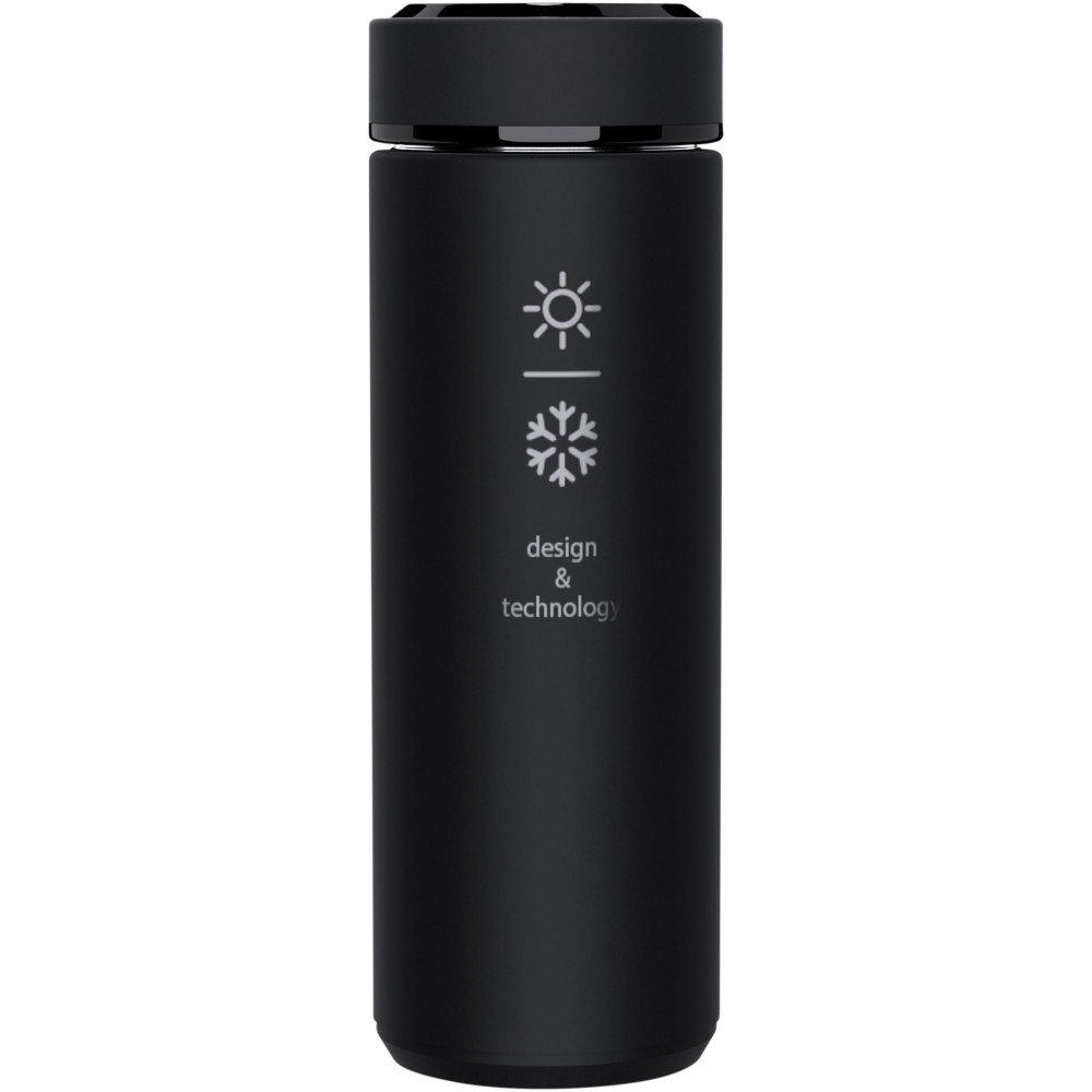 Duplafalú 500 ml-es szigetelt, rozsdamentes palack antibakteriális kezeléssel és hőmérséklet-érzékelővel. A Touch & Light rendszernek köszönhetően az ital hőmérséklete megjelenik a palack kupakján (Celsius fokban). Meleg és hideg italokhoz egyaránt alkalmas. Újrahasznosított papírból készült, hengeres díszdobozban szállítjuk. Mérete: d: 47 x 225 mm. Elem: CR 2450 (3V). Az akkumulátor nem cserélhető. 20 000-szer képes megjeleníteni a hőmérsékletet.