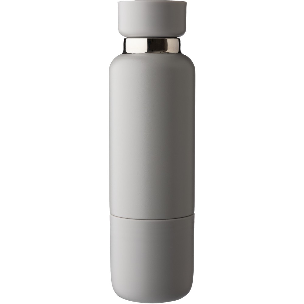 Rozsdamentes acél duplafalú, vákuumos palack PP pohárral az alján. Belseje 304 rozsdamentes acél, kívül 201 rozsdamentes acél. PP fedél AS átlátszó zárással, poliészter csuklópánttal és hordszíjjal. Matt színek. Barna kartondobozba egyedileg csomagolva érkezik. A palack űrtartalma: 500 ml, a pohár 300 ml.