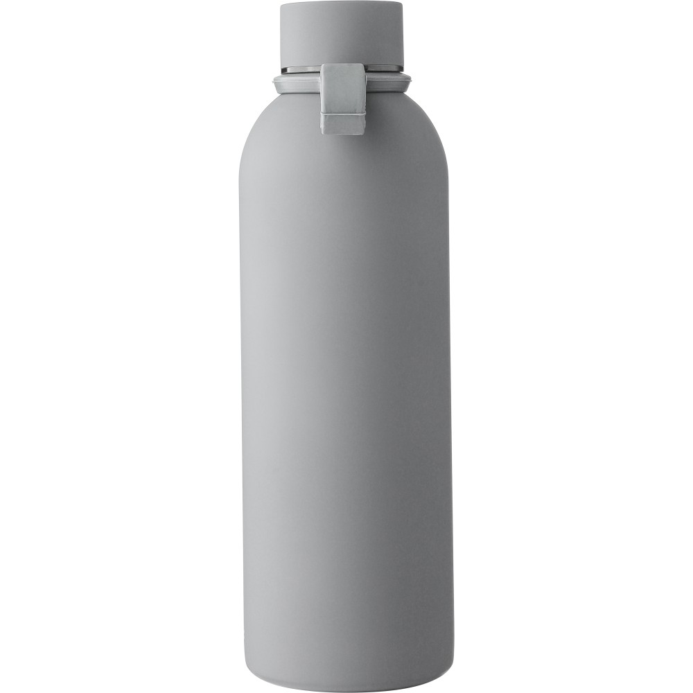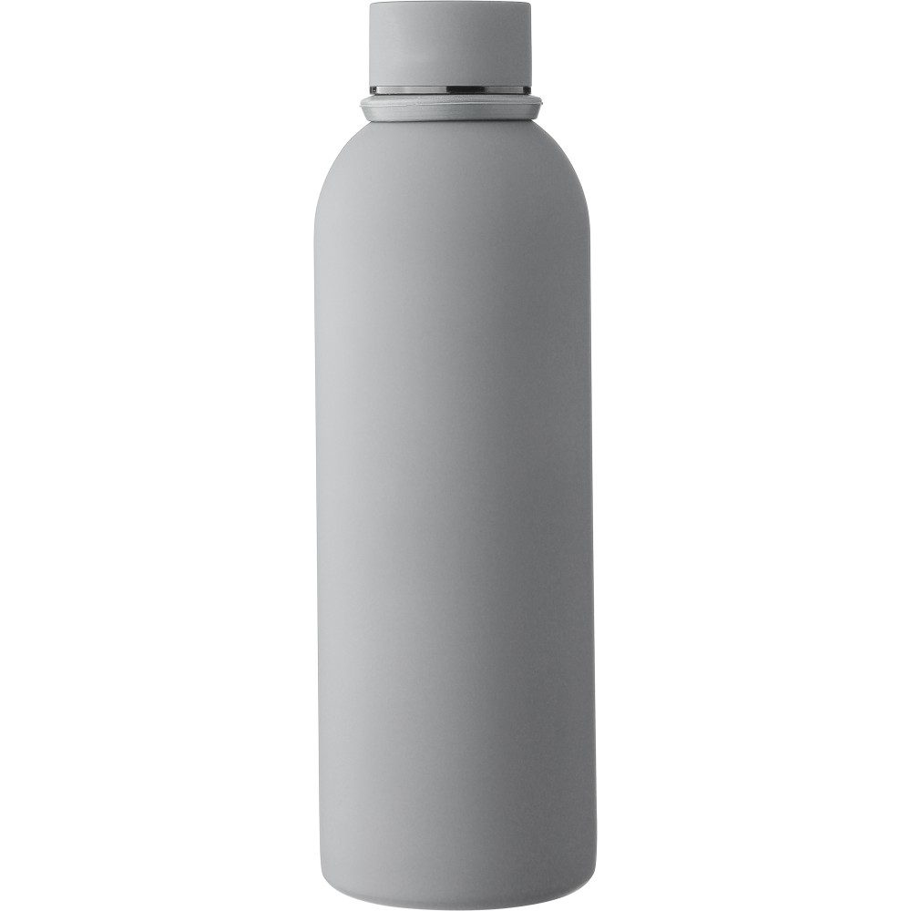 Újrahasznosított rozsdamentes acélból készült duplafalú vákuumpalack, 500 ml-es. 304-es rozsdamentes acél belsővel és 201-es rozsdamentes acél külsővel. Gumírozott felülettel, fém díszítésű csavaros PP kupakkal és szilikon hordfüllel. Gravírozott, újrahasznosított logóval. Csomagolása barna papírdoboz.