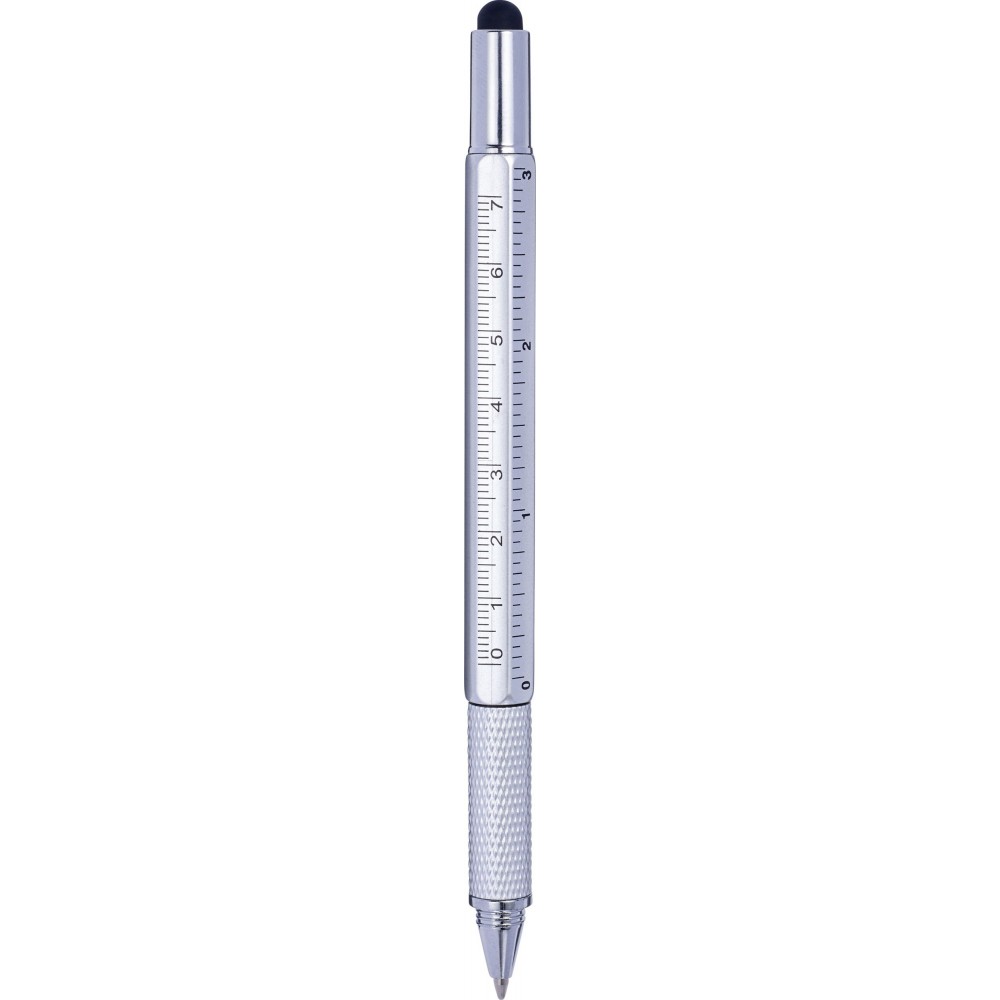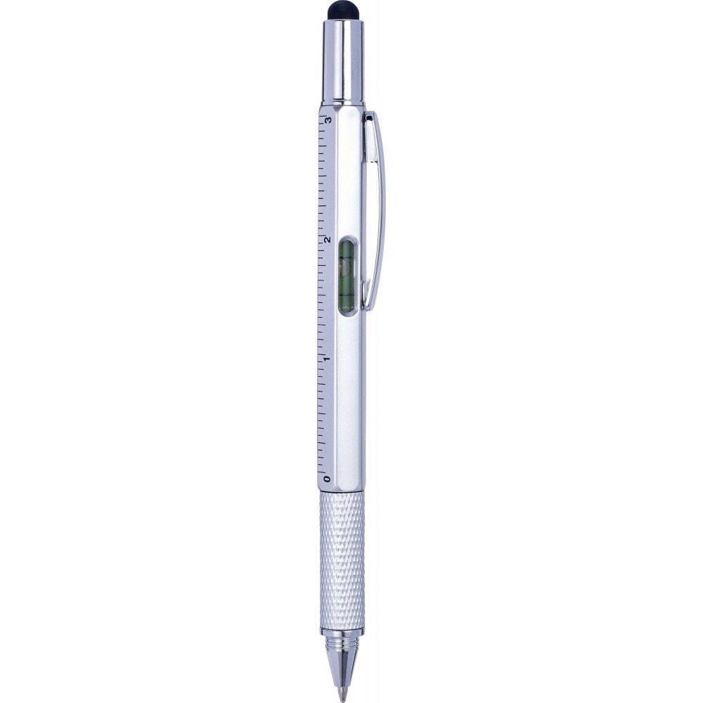 Többfunkciós golyóstoll csavaros mechanikával, fekete tollbetéttel, érintővel, vízszintezővel és vonalzóval az oldalán. ABS műanyag.