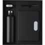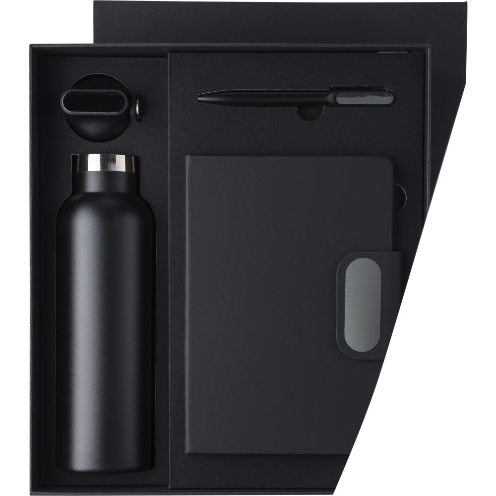 Karton ajándékkészlet duplafalú, újrahasznosított rozsdamentes acél kulaccsal (304 belül és kívül) szilikon fogantyúval, újrahasznosított alumínium csavaros golyóstollal (kék tintával), és újrahasznosított PU jegyzetfüzettel. A jegyzetfüzet 80 lapos, 70 g/m2-es vonalas lapokból áll, szalagos könyvjelzőt és fém mágneses zárat tartalmaz fegyveracél gravírozott lemezzel. Minden termék újrahasznosított logóval van ellátva.