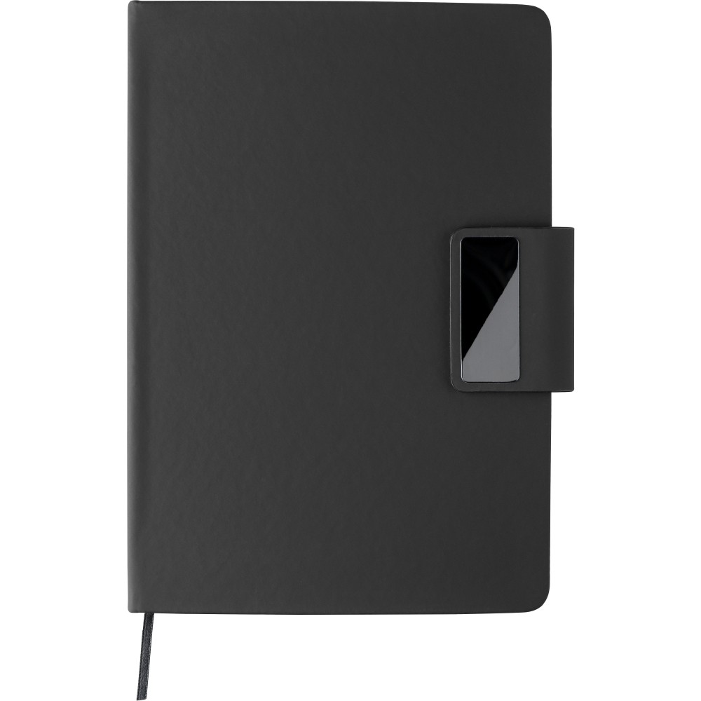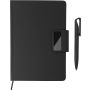 Karton ajándékkészlet. Tartalma: újrahasznosított alumínium csavaros golyóstoll kék tintával és újrahasznosított PU jegyzetfüzet. A jegyzetfüzet 80 lapos 70 g/m2-es vonalas papírral, és szalagos könyvjelzőt és fém mágneses zárat tartalmaz fegyveracél gravírozott lemezzel. Mindkét termék újrahasznosított logóval van ellátva: dombornyomva a jegyzetfüzeten és gravírozva a tollon.