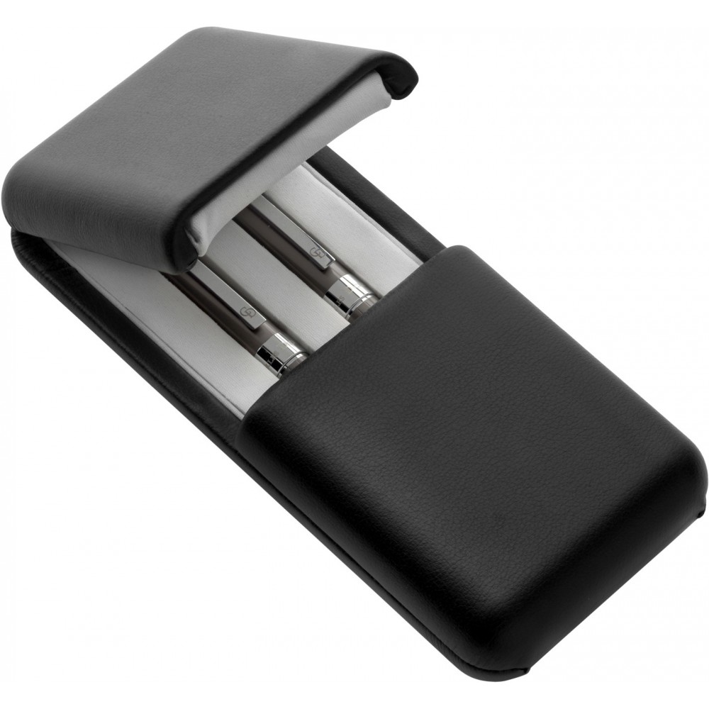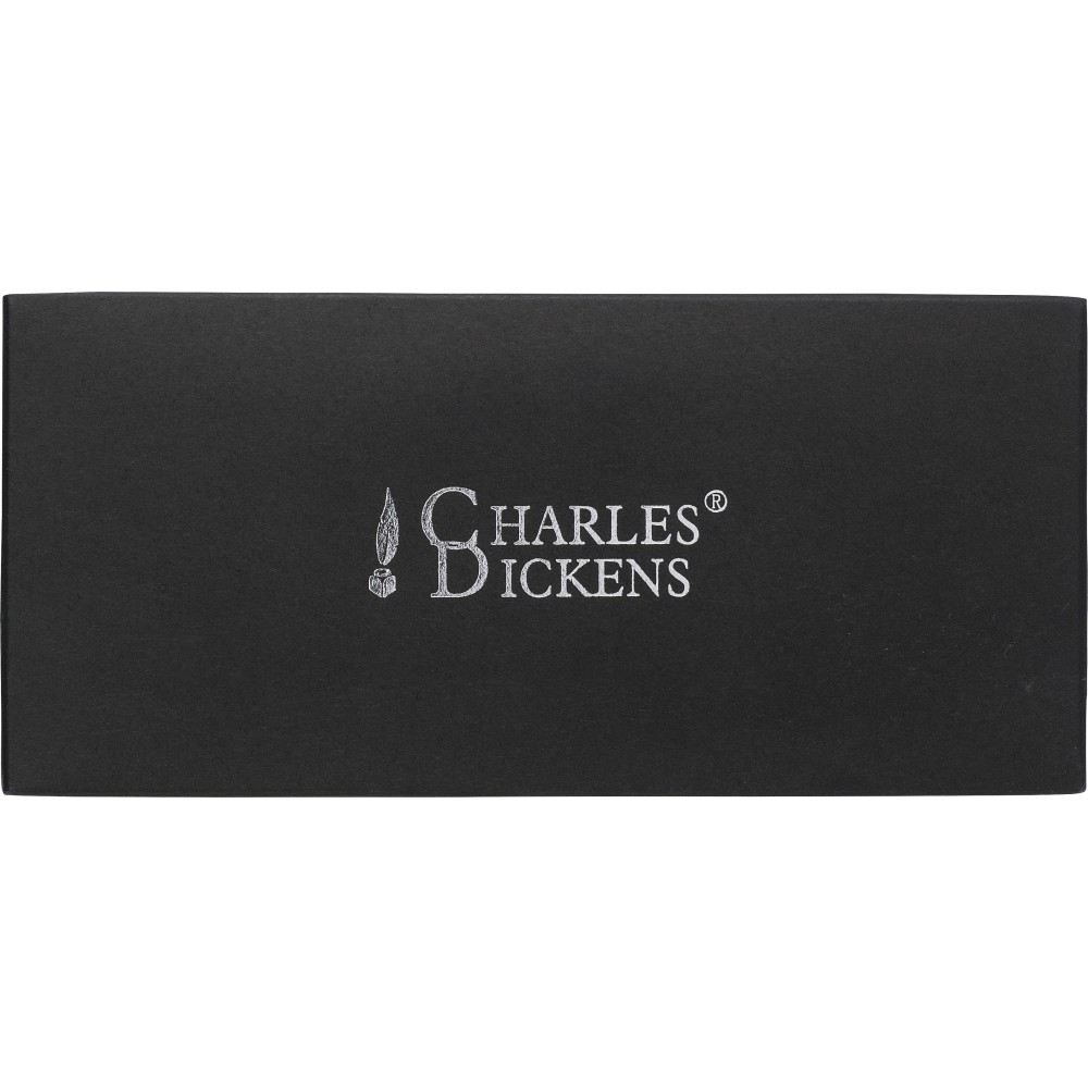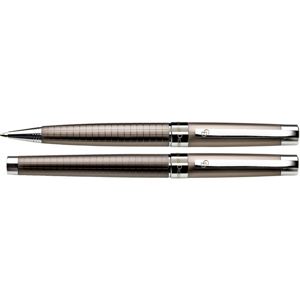Charles Dickens tollkészlet. Metálos fényű szürke golyóstoll és rollerball fekete tollbetéttel, dupla záródású díszdobozban.