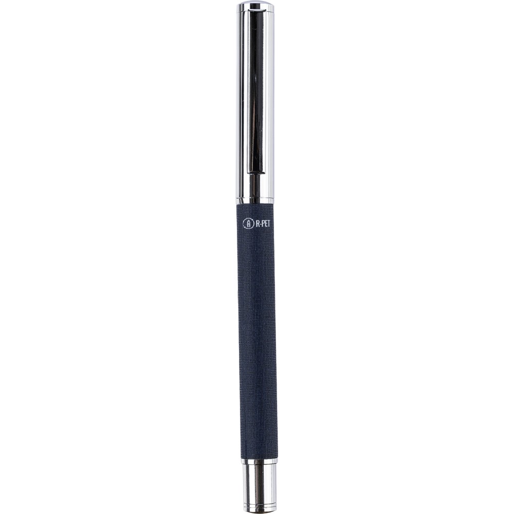 Sárgaréz és rPET golyóstoll fém klipsszel és markolattal. Csúszó mechanizmussal és rPET logóval a tolltesten. Egyenként csomagolva barna kartondobozban. Kék tintával.