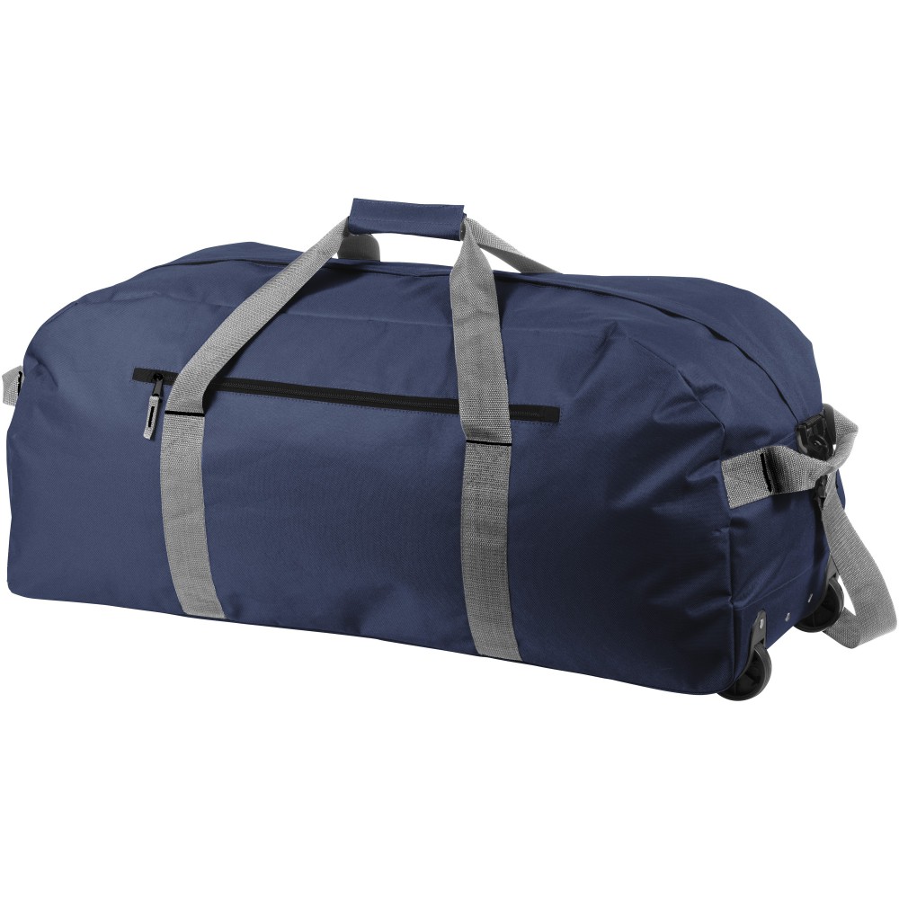 Nagy utazótáska cipzáras fő rekesszel és cipzáras elülső rekesszel, valamint görgős rendszerrel.