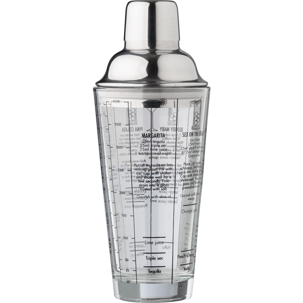 Üveg koktél shaker (400 ml) rozsdamentes acél (s/s304) fedéllel. Koktélreceptek találhatóak nyomtatva az oldalán. Egyedi csomagolásban, barna kartondobozban.
