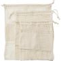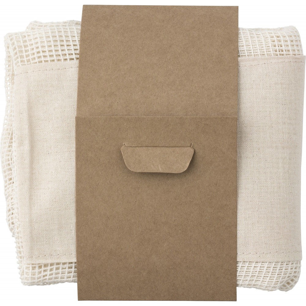 Többször használható, 3 darabos, hálós pamuttáska szett, stílusban illeszkedő kraftpapír csomagolásban. A táskák húzózsinórral zárhatóak és a sima pamut felület teret hagy az emblémázásnak.