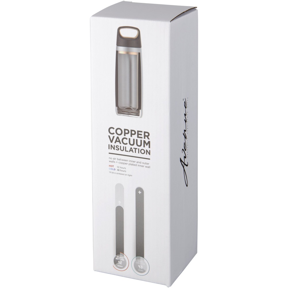 Duplafalú sportpalack réz-vákuumos szigeteléssel. Hidegtartó képesség 48 óra, melegtartó képesség 12 óra. A duplafalas kialakításnak köszönhetően nincs párakicsapódás. Csavaros fedél parafa berakással. Szivárgásmentes. Szénsavas italokkal nem használható. Mosogatógépben nem mosható és mikrohullámú sütőben történő melegítésre nem alkalmas. Űrtartalom: 600 ml. Csomagolása Avenue díszdoboz. Rozsadamestes acél és parafa.