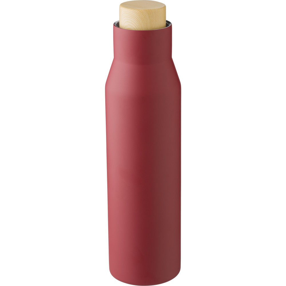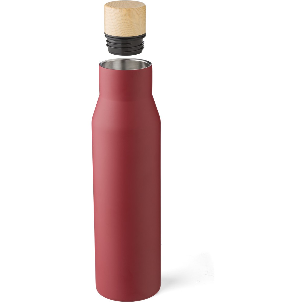 Rozsdamentes acél (s/s304), duplafalú palack fa tetővel. Barna kartondobozba egyedileg csomagolva. Űrtartalom: 500 ml.