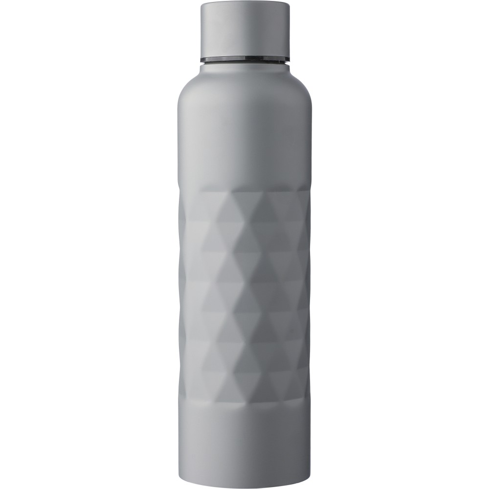 Újrahasznosított 304-es rozsdamentes acélból készült szimplafalú kulacs, 800 ml-es. Gyémánt alakú textúrával a testen, csavaros tetővel és lézergravírozott újrahasznosított logóval. Egyenként csomagolva, barna kartondobozban.