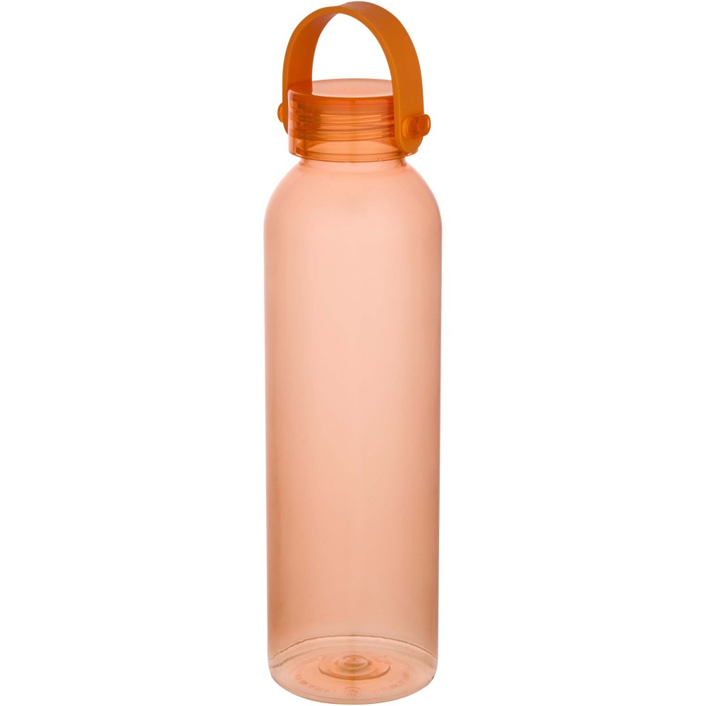 RCS tanúsítvánnyal rendelkező RPET-ből készült kulacs, praktikus szilikon hordozófüllel. Megfelel az EFSA által jóváhagyott PET-újrahasznosítási eljárásnak. Űrtartalom: 630 ml.